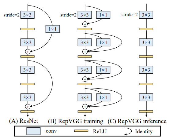 现有实用卷积神经网络架构(如ResNet、RegNet)多为多分支架构,结构复杂,并行度低,速度慢,内存利用率低。虽然经典的单路架构(如VGG-16)具有结构简单、并行度高、速度快、内存利用率高的特点,但是性能(精度)显著低于多分支架构,所以不实用。本文提出一种推理时单路径的卷积神经网络(称为RepVGG)和一种“结构重参数化”方法。这一方法可以将训练时的多分支架构与推理时的单路架构解耦:训练时的模型有多条分支,但在训练完成后将其通过结构重参数化方法等价转换为单分支的推理时模型。这一方法使得单路架构卷积神经网络性能比多分支网络更好或相当,又同时具有推理时结构简单、并行度高、速度快、内存利用率高的特点。