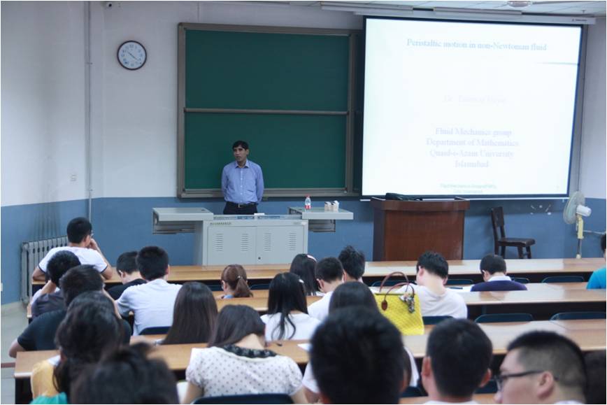 9月5日上午, Hayat教授在北校区阶梯教室J-508为公司师生做了题为“Peristaltic Motion of a Magnetohydrodynamic Generalized Second-Order Fluid in an Asymmetric Channel”的精彩报告,十大外围足球平台app150余名师生参加了报告会。