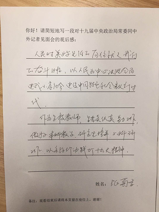 作为一名新入职的本科生辅导员,听完习近平总书记在记者见面会上的讲话,我深有感悟。来自各个国家的八百余封贺信彰显了我国的国际地位。对员工的思想政治教育和理想引领也“一个都不能少”。我要以实际行动,贯彻落实十九大的精神,立足本职工作,引导教育员工艰苦奋斗、不辱使命、刻苦学习,做国家的栋梁之才!