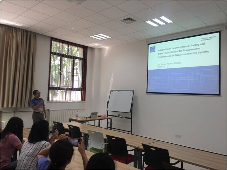 报告介绍了用监督控制理论来消除黑盒软件在重复利用时可能出现的错误。该方法利用基于自动机学习的软件测试方法来学习黑盒软件的模型,从而可以利用监督控制理论来纠错。这一项工作是监督控制理论的一个创新应用,对公司从事离散事件系统监督控制理论与应用研究领域的研究生与青年教师具有启发性。学术报告引起了与会师生的浓厚兴趣,大家结合自己在研究中遇到的问题与冯雷博士进行了积极交流。