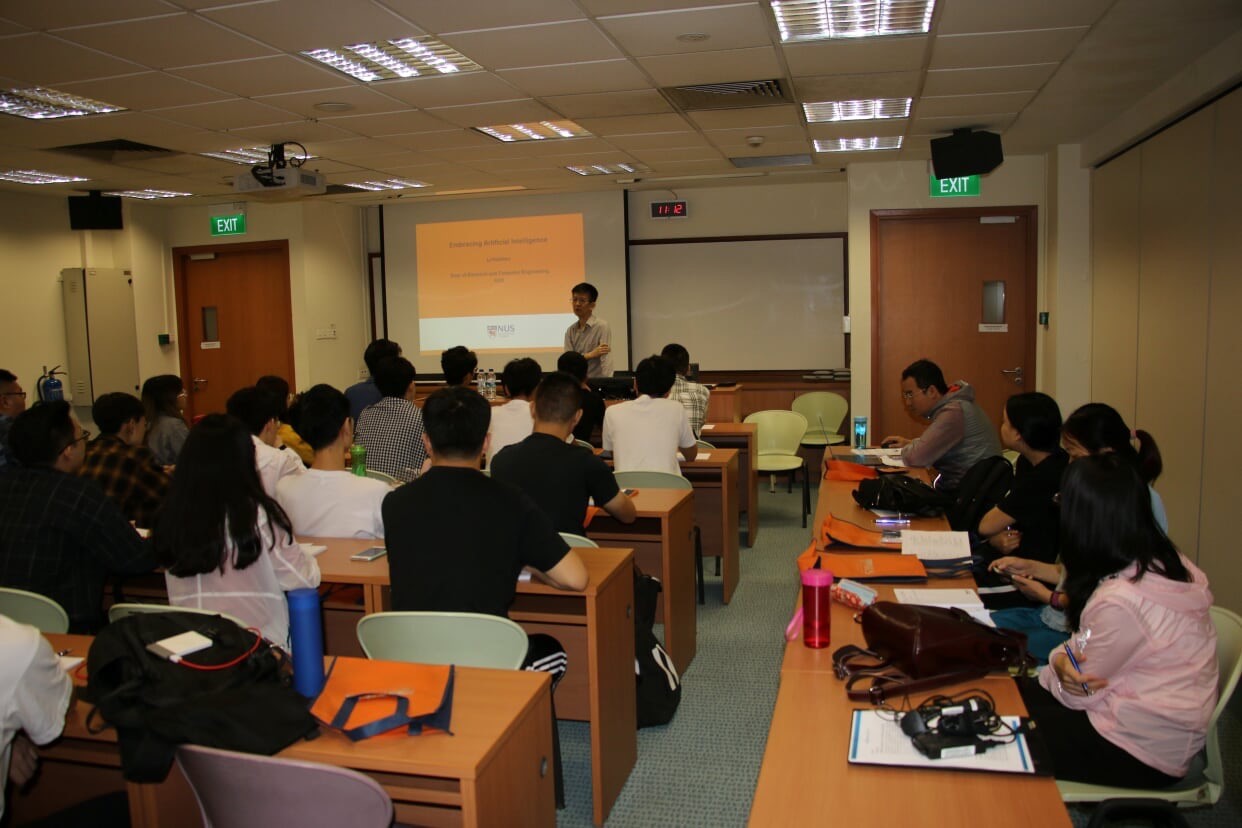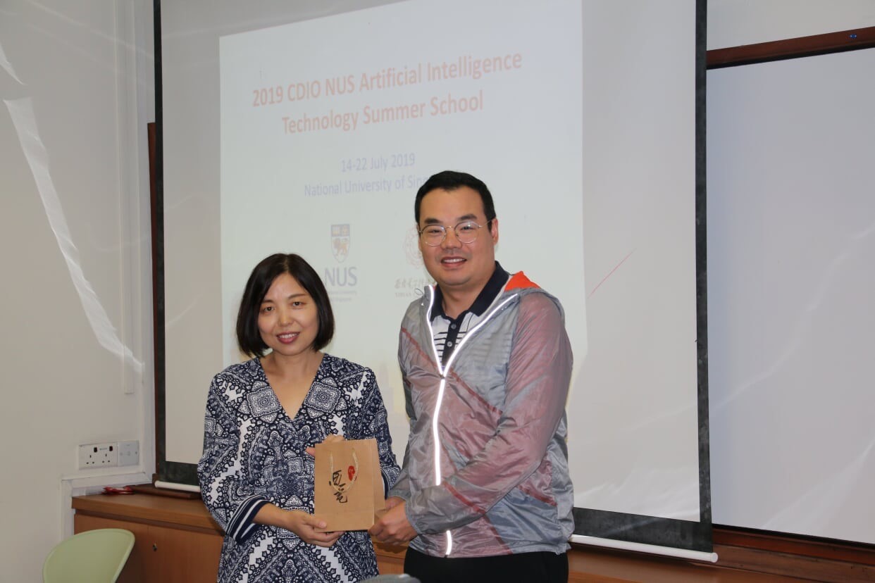 开营仪式由Zhang Rongli博士主持。张博士从活动安排、新加坡国情概况、教育体制和NUS介绍等方面向同学们做了讲解,拉开了智能机器人技术训练营的序幕,让同学对丰富的讲座和体验活动充满了期待。随后,十大外围足球平台app王飞老师向NUS张老师和李海洲教授赠送西电定制礼物,双方合影留念。随后,李海洲教授以人工智能的相关背景与发展以及语音处理的相关技术为题目,为同学们做了一场精彩的报告。