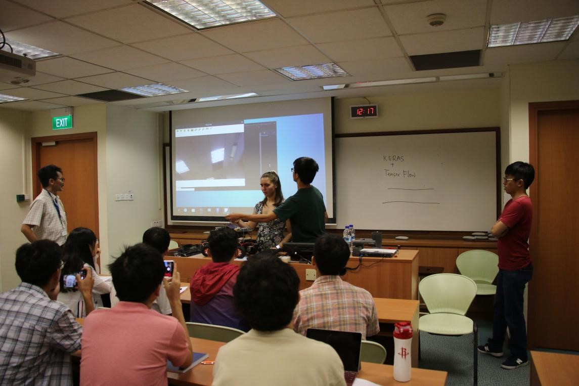 第二场报告中,教授Marcelo H Ang Jr 借助AI技术作为切入面,结合人脸识别技术、深度学习技术、机器人技术等技术交叉领域,详细地鉴述了无人驾驶的底层原理和应用案例。在报告最后,Dr Marcelo 邀请了三位来自加州的交流生使用智能追踪机器人,对人脸识别的智能技术做了实践演示。