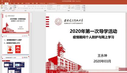 (通讯员 王永坤)2020年3月6日,十大外围足球平台app2018级学业导师王永坤通过QQ屏幕共享为他所指导的18名员工进行了疫情期间的第一次导学。导学的主题为《疫情期间个人防护与网上学习》,在导学中为同学们分享了疫情期间个人防护注意事项,以及如何通过“雨课堂”,“西电学堂”和“学在西电”等网页和app上进行自主学习。