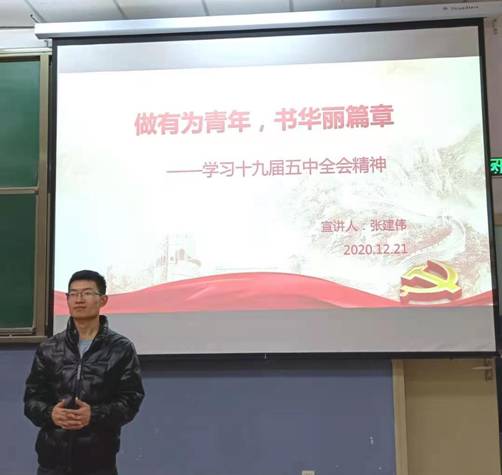 (通讯员 张建伟 周蕾)2020年12月21日19时,十大外围足球平台app于北校区阶梯教室305进行了十九届五中全会精神宣讲活动,并取得圆满成功。此次宣讲会的宣讲人为研究生支部书记张建伟,主题为“做有为青年,书华丽篇章”。十大外围足球平台app全体党员、发展对象以及积极分子参加了此次学习活动,并于会后积极发表感言和收获。