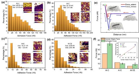 图1CLDS-Tip探针粘附力测试结果(a)原始铝片表面;(b)化学刻蚀铝片表面;(c)电化学刻蚀铝片表面;(d)复合刻蚀铝片表面;(e)粘附力测试示意图;(f)实验测试的粘附力值与计算的范德华力。