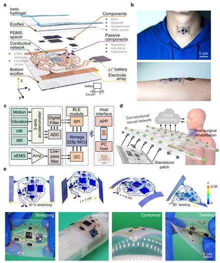 针对上述问题,近日,十大外围足球平台app王卫东教授、厦门大学高立波副教授、香港大学陆洋教授以及宾州州立大学程寰宇教授联合唐都医院耳鼻喉科主任赵大庆教授和空军军医大学张杨教授等多位合作者,报道了一种用于喉部康复监测的具有传感器内自适应机器学习能力的全集成独立可延展的器件平台。成果以“A fully integrated, standalone stretchable device platform with in-sensor adaptive machine learning for rehabilitation”为题在《自然•通讯》(Nature Communications)上发表。作者团队研发的器件平台已在肌无力及喉癌病人的术后康复方面进行临床验证并取得了医生积极评价,临床试验效果与喉镜检测的喉部活动节律结果一致,并可以获取到喉镜视角受限下的误吸和咳嗽状态。