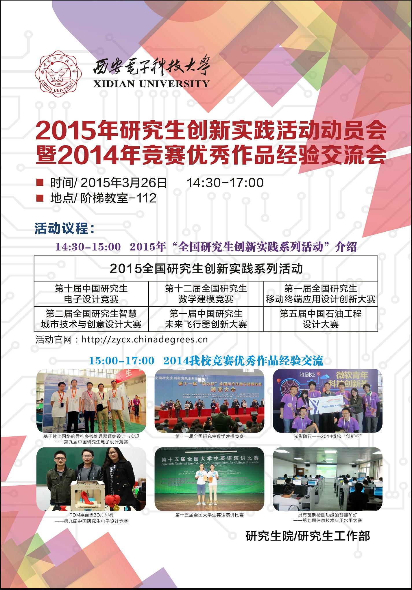 阶梯教室112召开“十大外围足球平台app2015年研究生创新实践活动动员会暨2014年竞赛优秀作品经验交流会”。届时,将向大家介绍2015年研究生创新实践活动六大赛事的具体情况,并由 2014年度竞赛获奖优秀队伍介绍参赛经验。