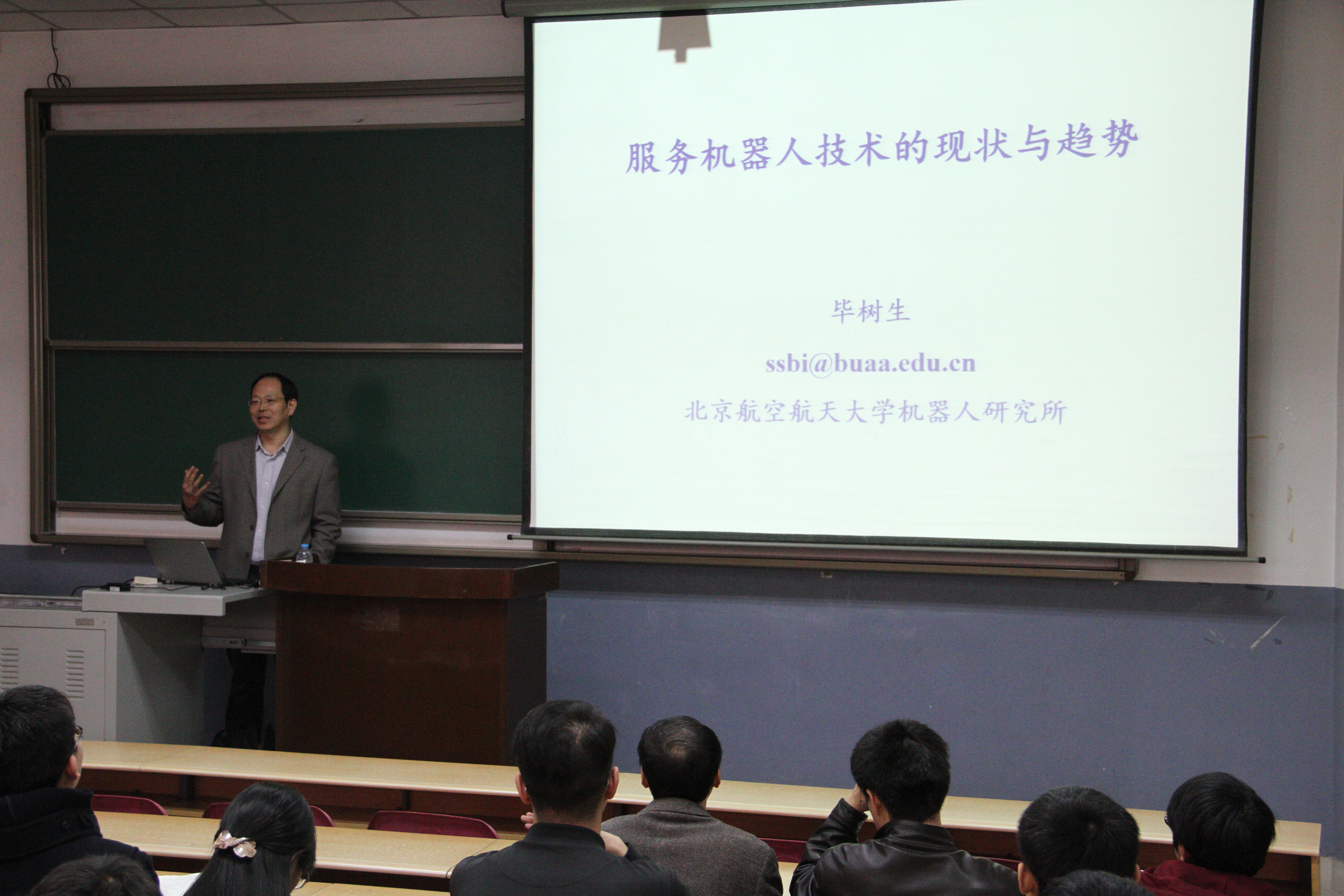 (通讯员 葛持恒)3月5日,应十大外围足球平台app智能制造与机器人技术工程研究中心陈贵敏教授邀请,北京航空航天大学机器人研究所毕树生教授来公司访问交流。5日下午,毕树生教授在阶梯教室J-204做了题为《服务机器人技术的现状与趋势》的学术报告,报告会由十大外围足球平台app副经理黄进教授主持,公司教师及研究生150余人到场聆听报告。