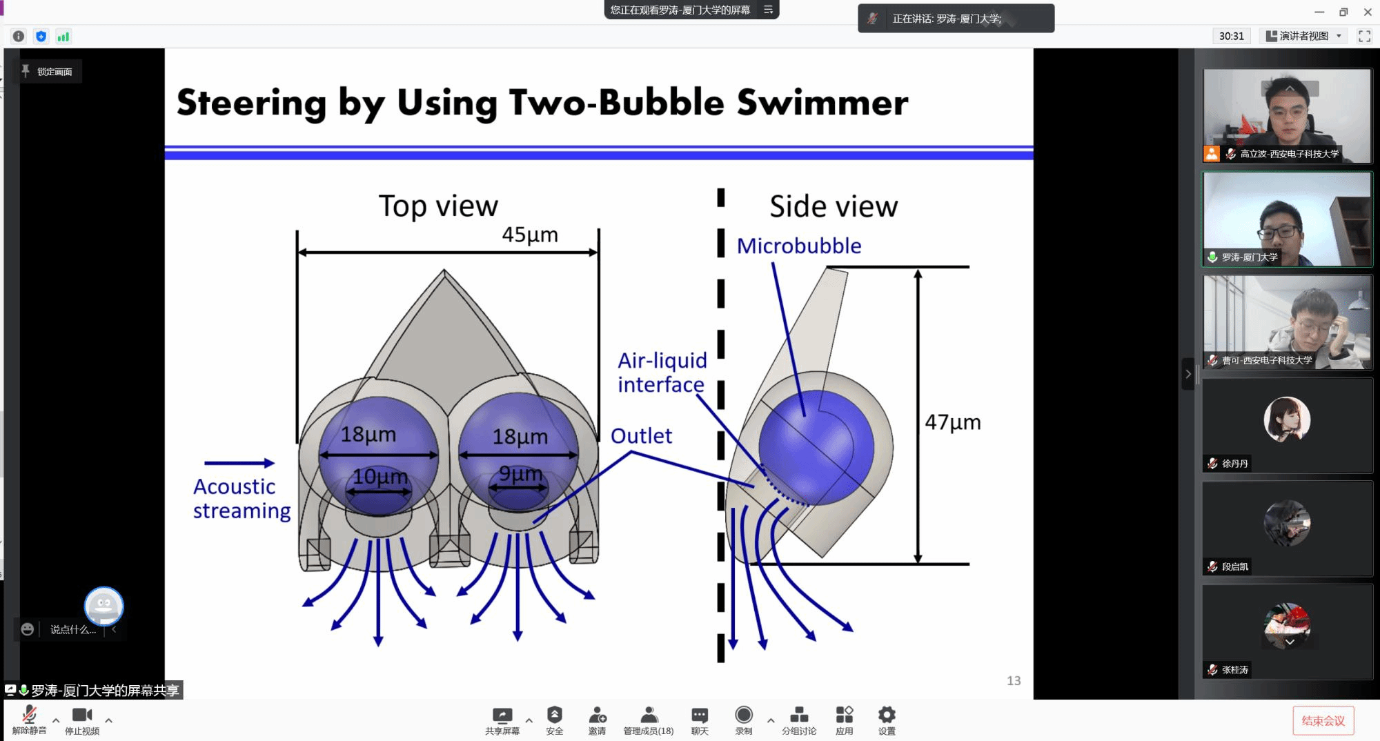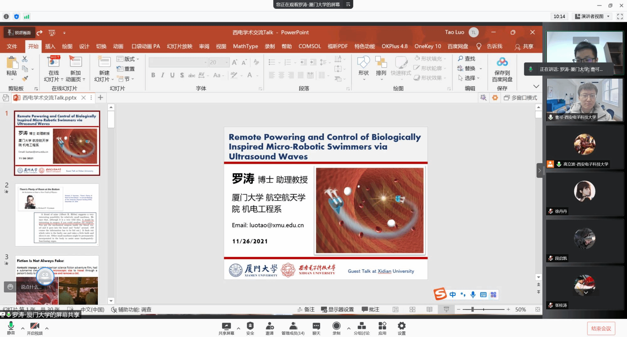 (通讯员 高立波)11月26日上午,应十大外围足球平台app高立波的邀请,厦门大学航空航天公司机电工程系助理教授应邀在线上作了题为《Remote Powering and Control of Biologically Inspired Micro-Robotic Swimmers via Ultrasound Waves》的学术报告。本次报告因疫情原因改为线上,高立波,王明智,曹可等测控系师生参加,高立波副教授主持。